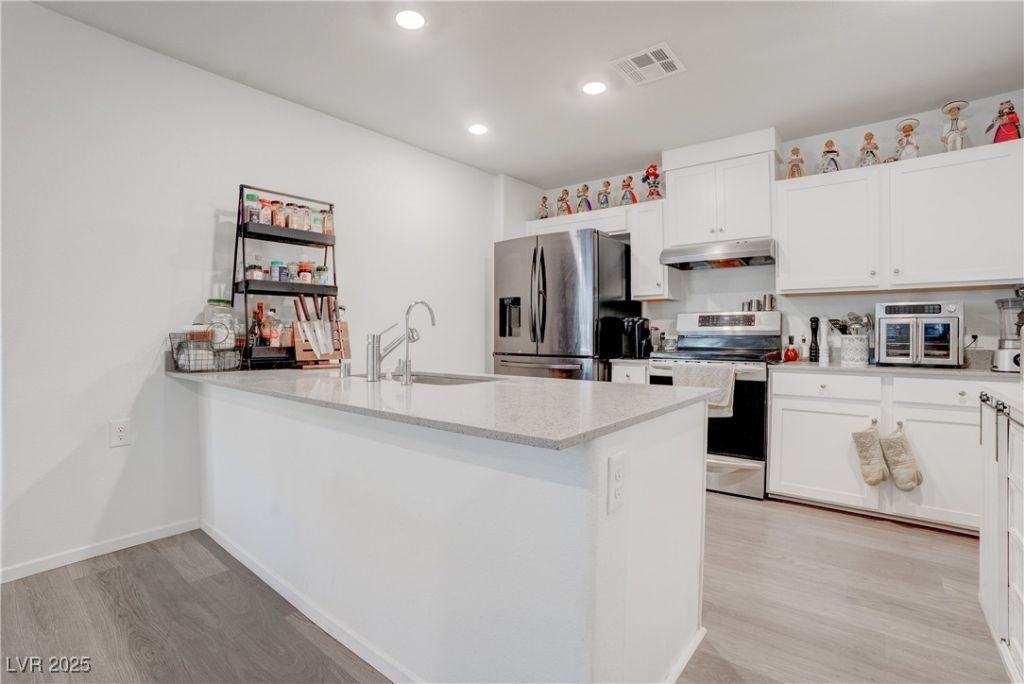 EXTREMELY RARE FIND One-story townhome built in 2024 with a 5.25% FHA Assumable mortgage (Save on payments!) Only one property attached and generous spacing between other homesites. Home sits in fabulous location in the community on a large corner lot next to park and across from pool. Home is ADA compliant with a massively oversized one car garage for extra storage or wheelchair access from vehicle. Open floor plan concept with upgraded white cabinets, luxury vinyl plank flooring throughout (no carpet!), quartz countertops and fully fenced backyard (no need to update backyard for compliance). Growing and developing area close to great eateries, shopping, Aliante Casino/Resort, parks and so much more! Experience the new master plan of Valley Vista and enhance your quality of life. Contact us or your Buyer's agent to schedule a private tour or for further information.